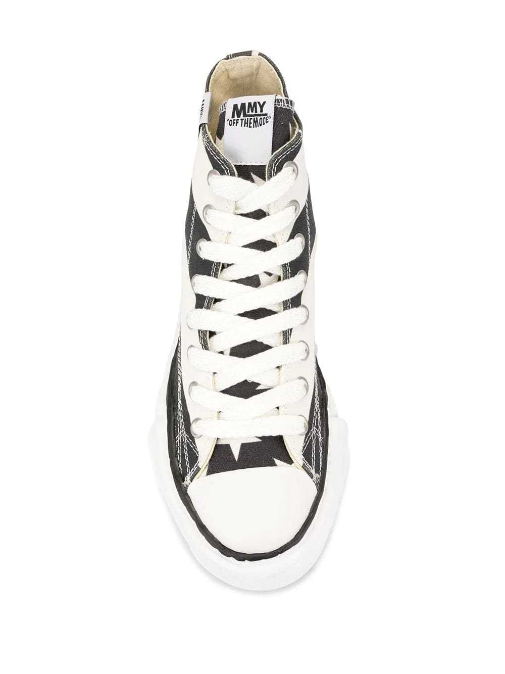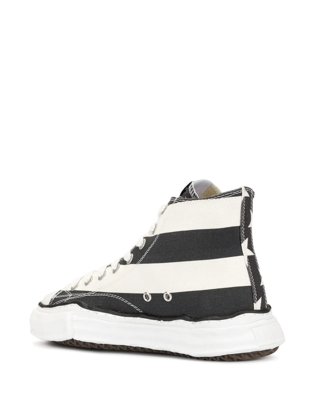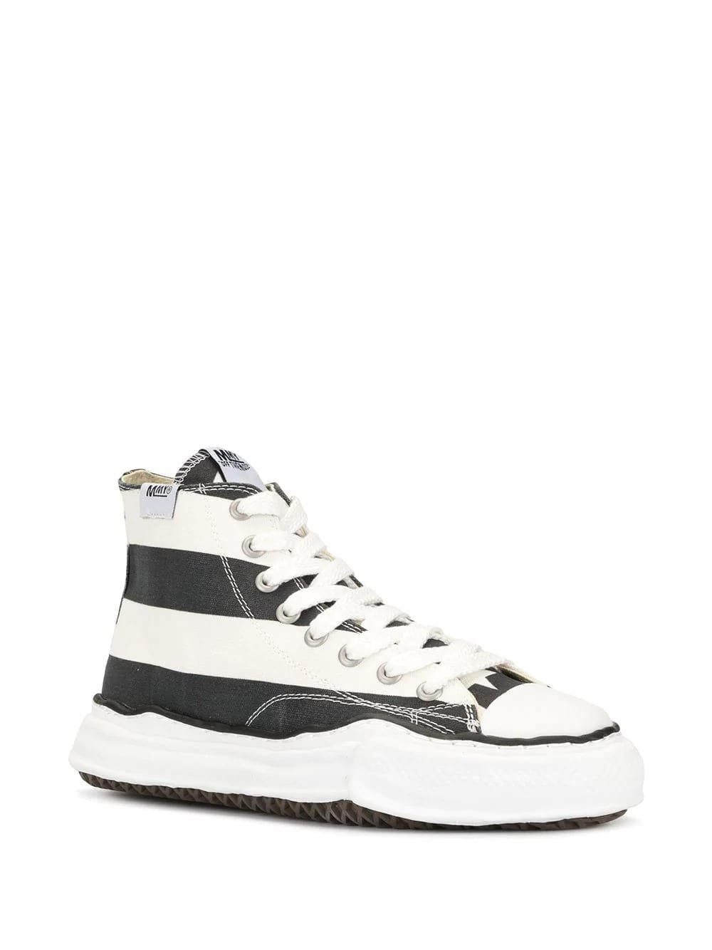 Black and white striped hi-top sneakers from Maison MIHARA YASUHIRO featuring a flat heel, a ridged rubber sole, a round toe and a lace-up front fastening.